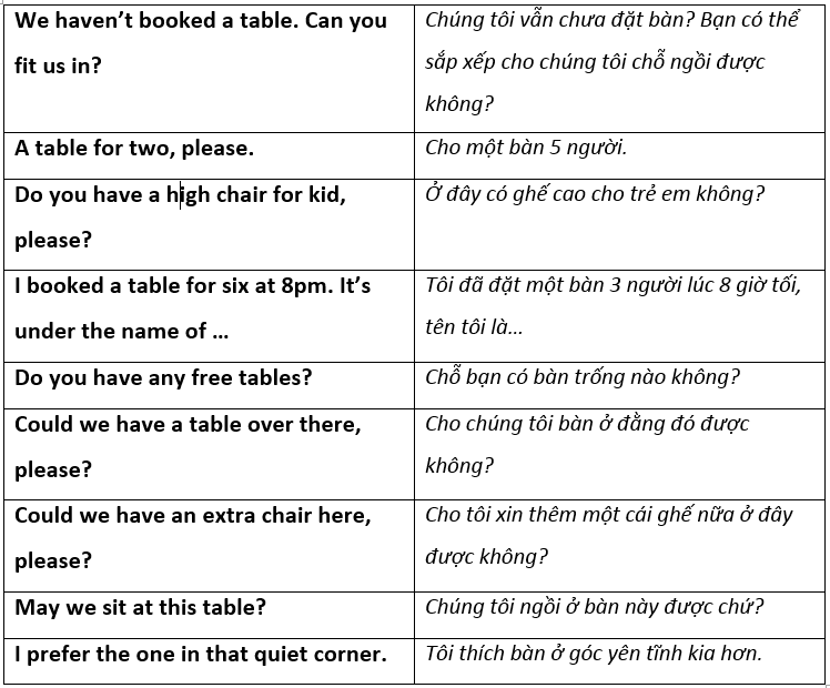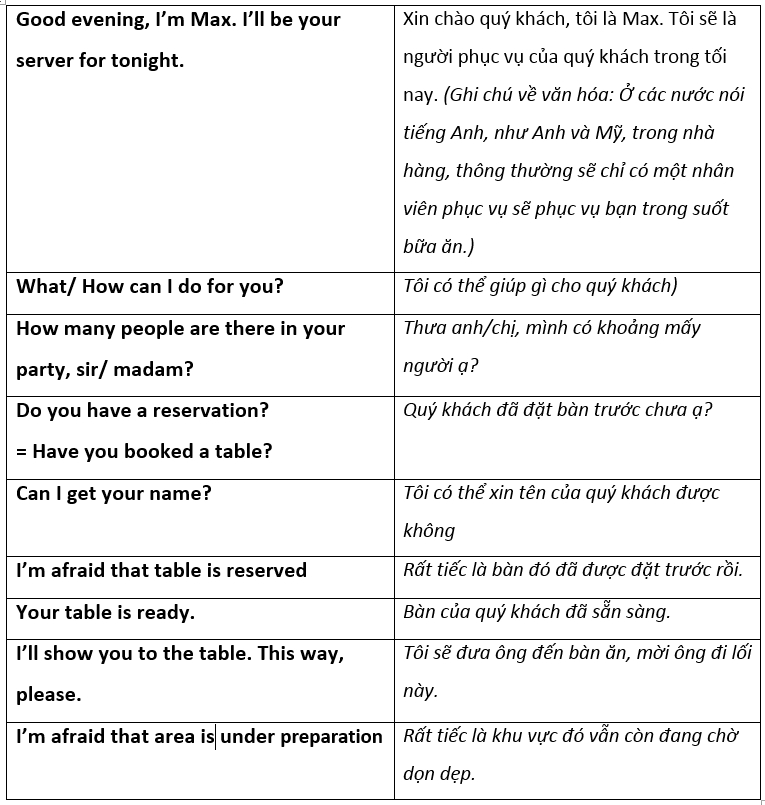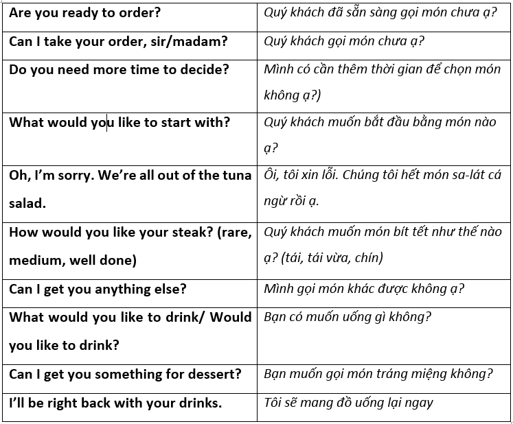 I. Mẫu câu giao tiếp dành cho nhân viên nhà hàng