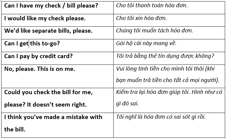 Trên đây là những mẫu câu giao tiếp thông dụng trong nhà hàng dành cho cả nhân viên phục vụ và thực khách. Nắm vững những cấu trúc này sẽ giúp bạn tự tin hơn, phản xạ nhanh hơn khi gặp các tính huống khác nhau tại nhà hàng.
